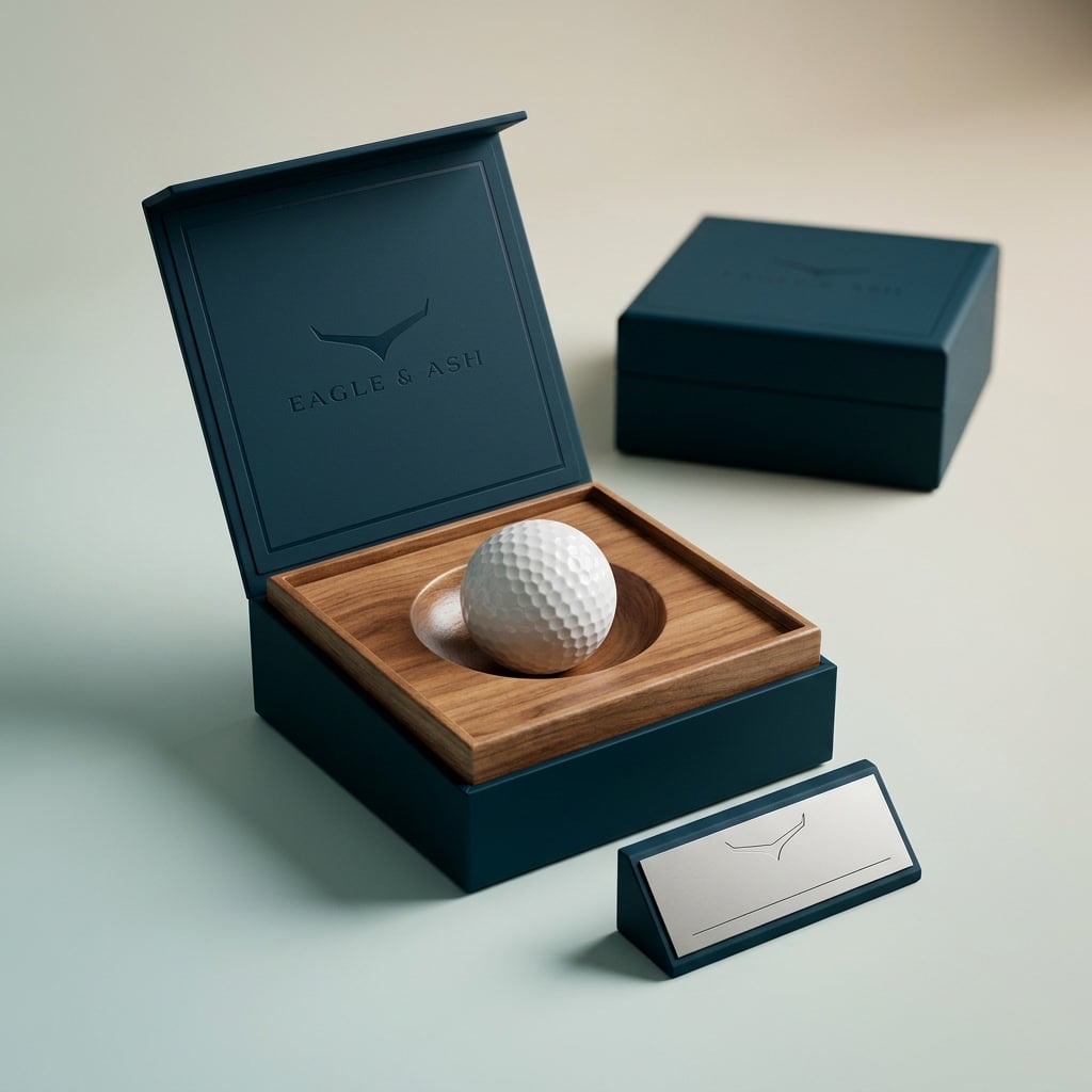 Every piece leaves the studio in signature packaging — diagonal amber wedge, soar-pattern interior, tagline running the seam. Engraving on request. No gift-wrap tax.